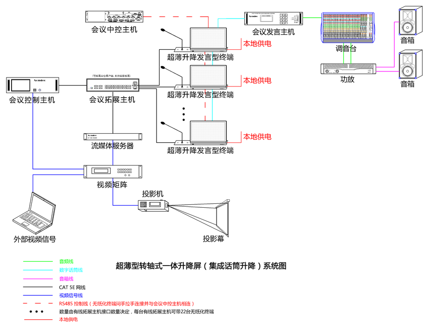 1、系統拓撲結構簡單,所有(yǒu)桌牌顯示、同步數(shù)據、文(wén)稿、視(shì)頻(pín)統一(yī)走局域網,實現(xiàn)了(le)純數(shù)字純網線的(de♠)組網連接,極大(dà)降低(dī)了(le)施工(gōng)複雜(zá)度,提高(gāo)了(le)系統穩定性和(hé)可(kě)維護性。
